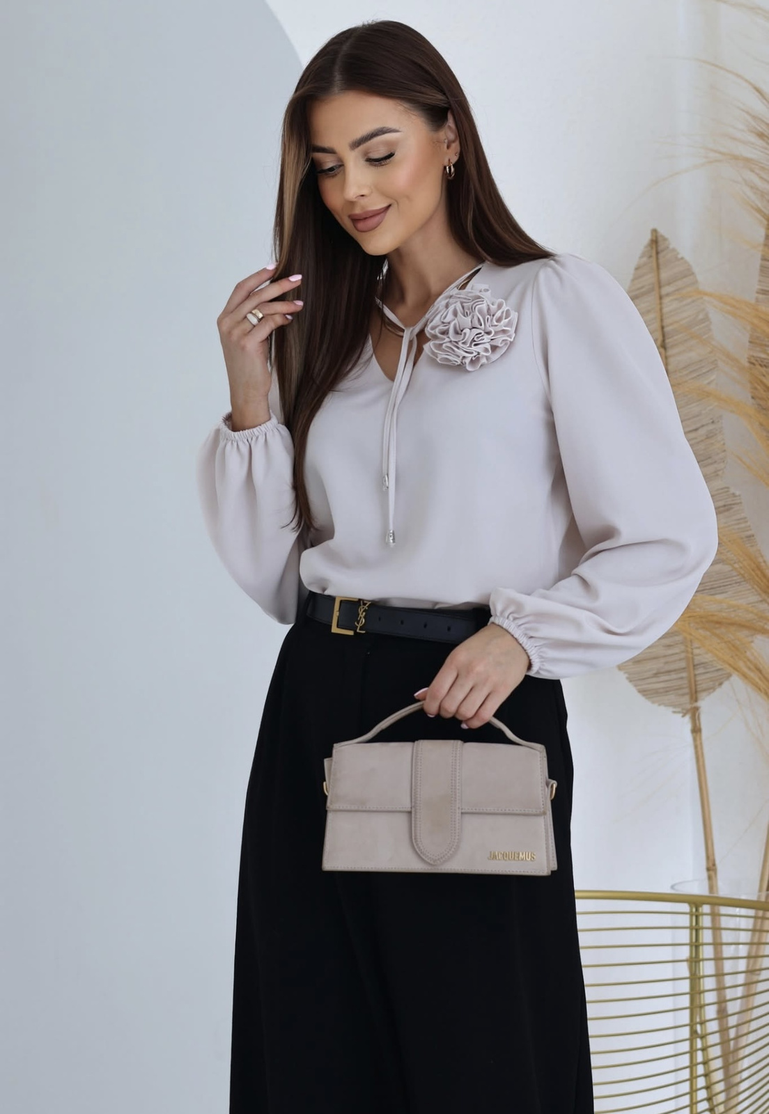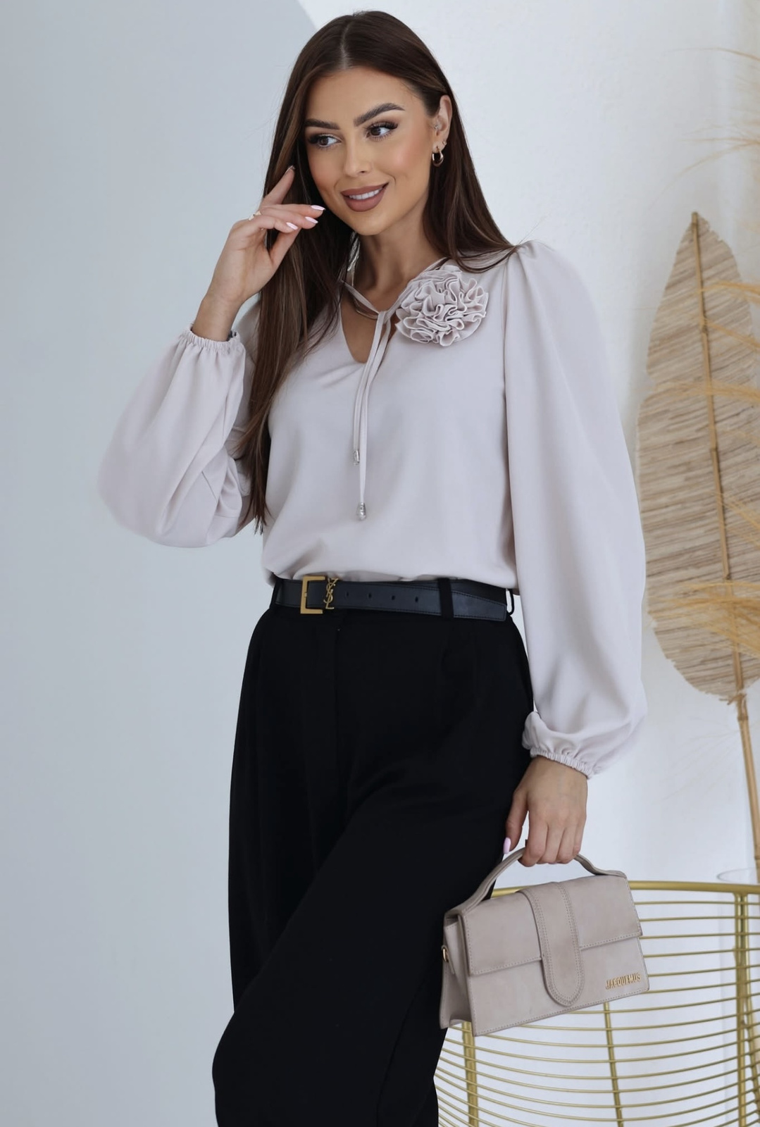 Beżowa gładka bluzka damska ze ściągaczem przy rękawie i ozdobna różą STELLA