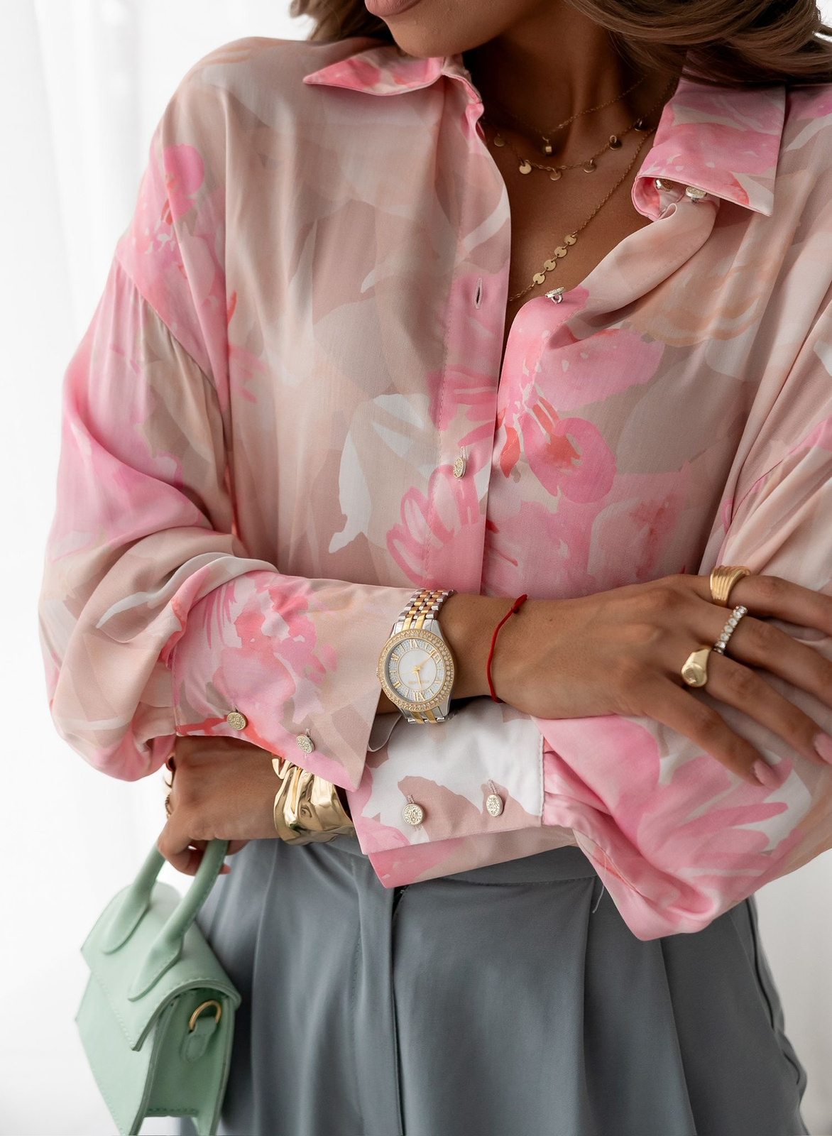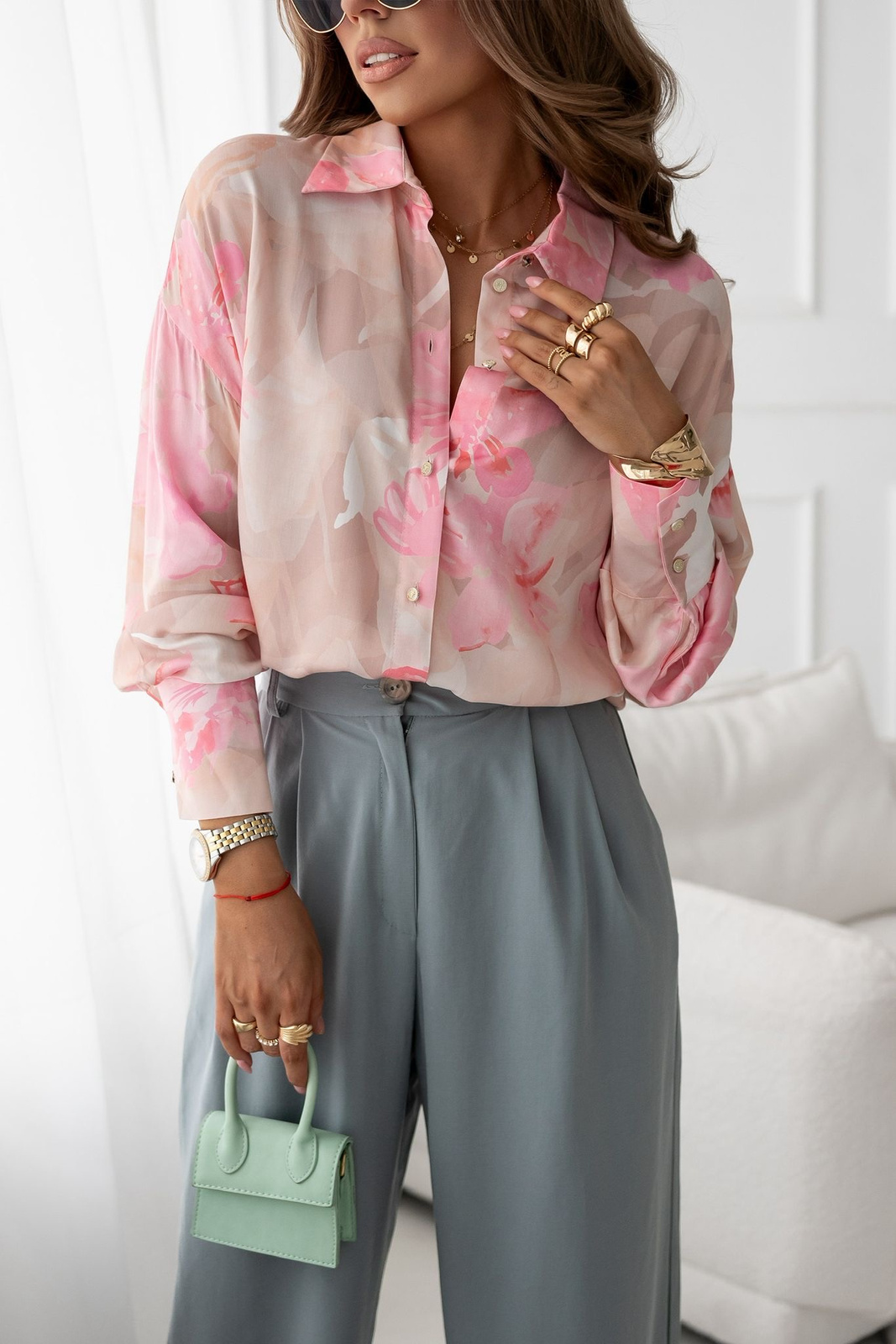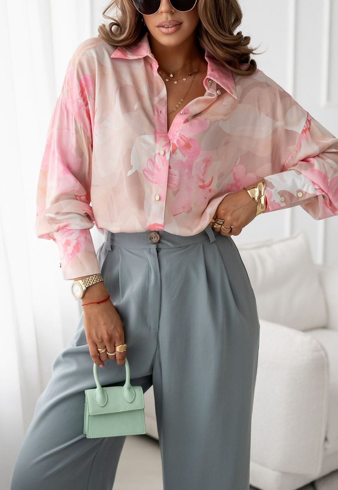 Przepiękna koszula damska we wzory- koszula cudownie komponuje sie z dżinsami, ale także materiałowymi spodniami. Piękne połączenie kolorów sprawią, że będziesz czuła się w niej wyjątkowo.. Polski producent, doskonała jakość wykończenia. Zapinana na małe złote guziki. Rekaw wykończony wysokim mankietem. Obniżona linia ramion. Koszula to modeli oversize. Modelka ma na sobie rozmiar XS.