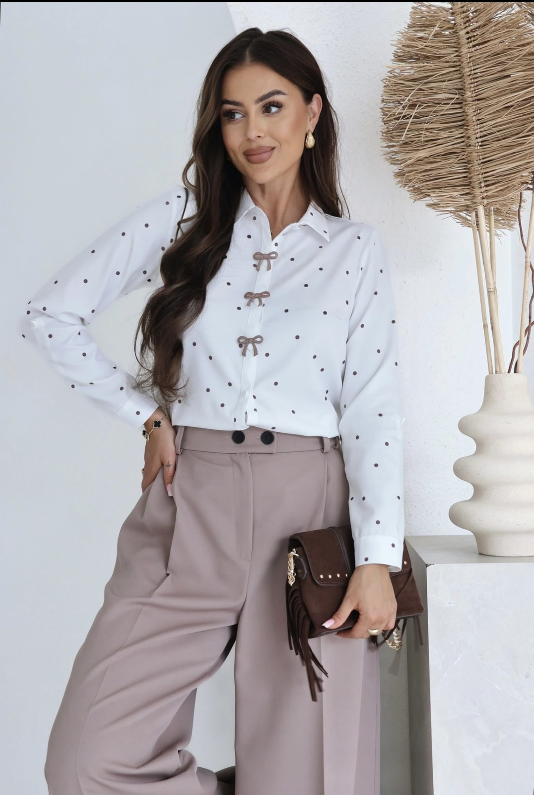 klasyczna koszula damska w kropki.Koszula posiada również ozdobne kokardki w postaci broszki które możemy odpiąć i wykorzystać do innej stylizacji. Świetnie komponuje się z jeansami jak również ze spodniami materiałowymi.