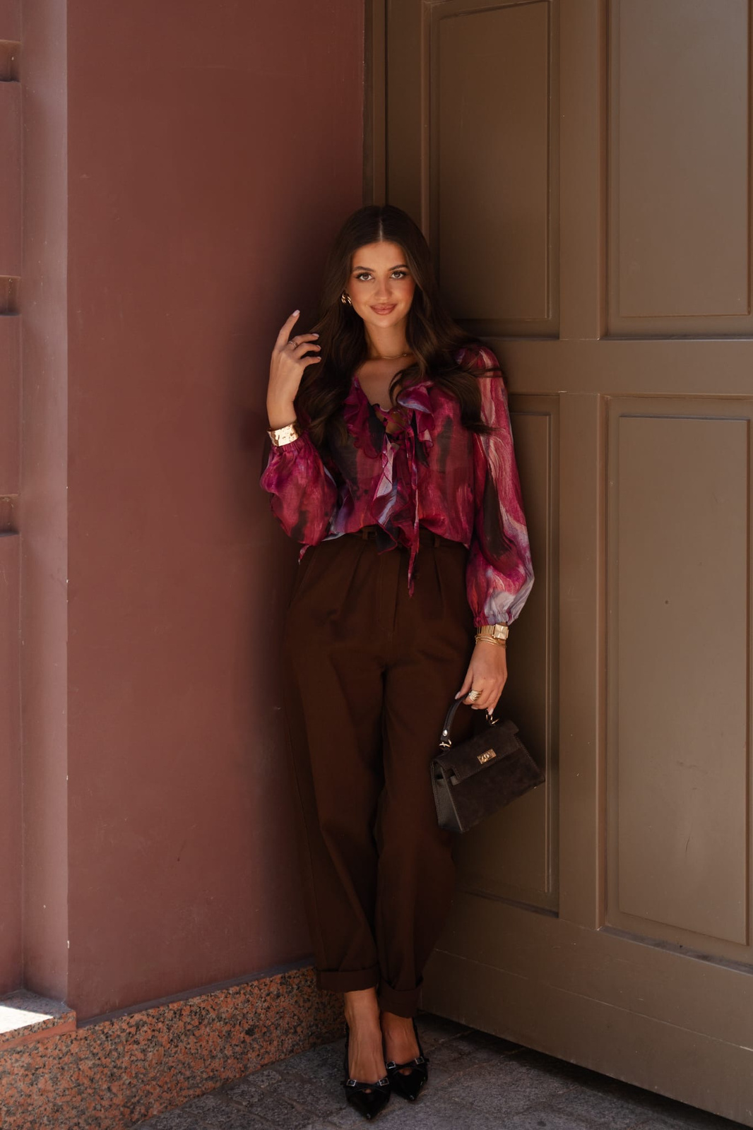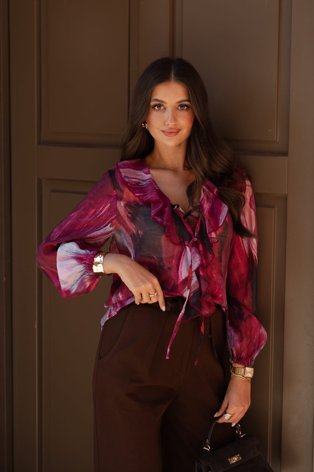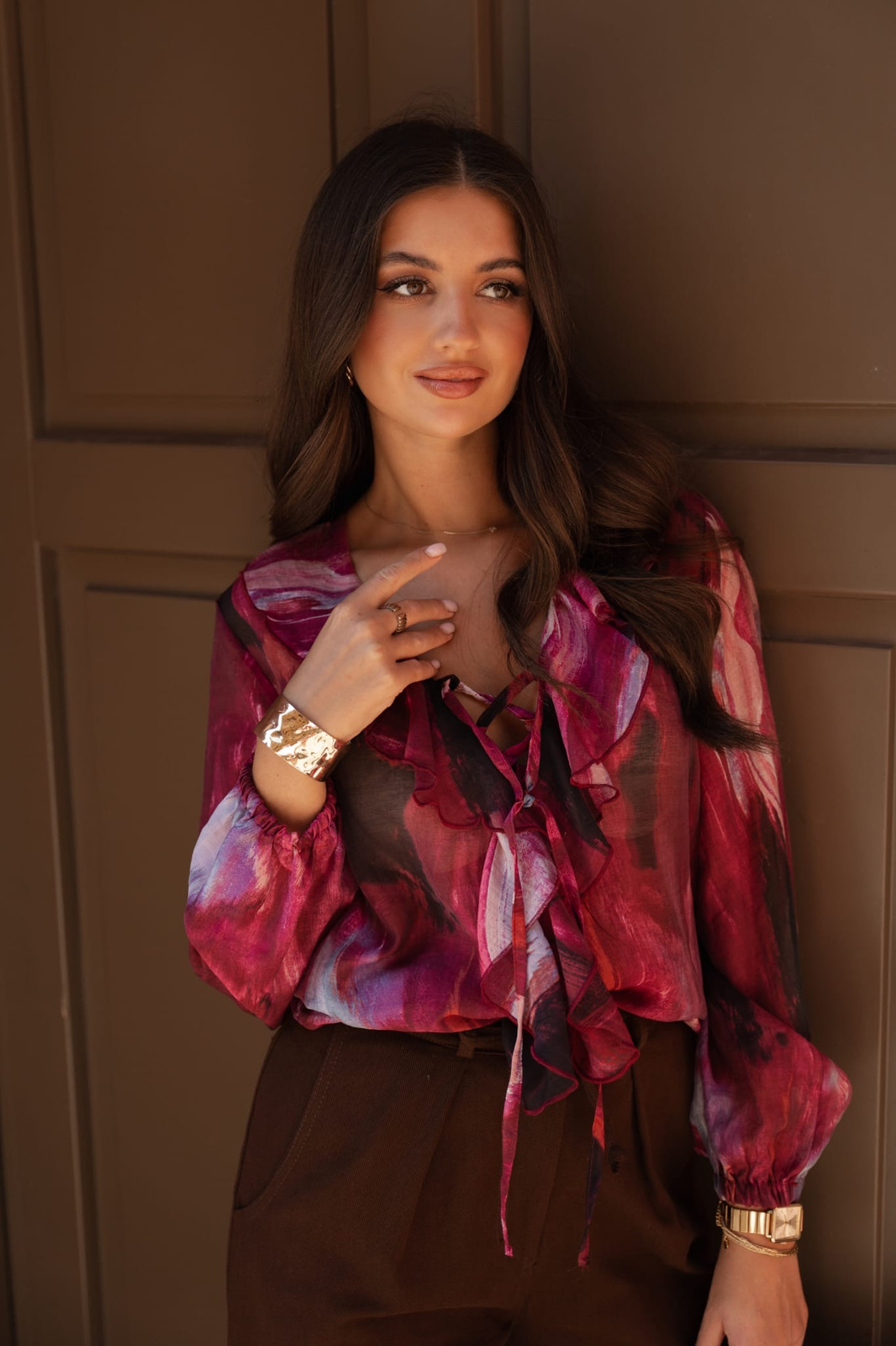 Bordowa bluzka damska z ozdobną falbaną COMO