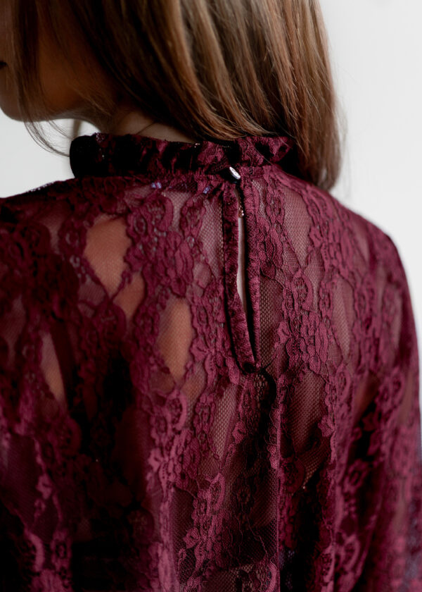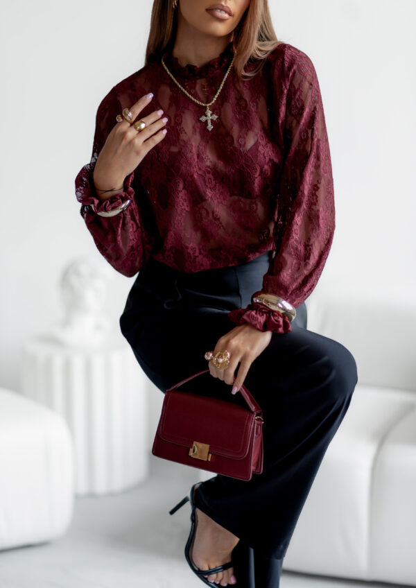 Piękna bluzka damska wykonana z deli8katnej miłej w dotyku koronki . Bluzka świetnie sprawdzi się zestawiona z klasycznymi dżinsami. Wykończona delikatna falbanka wokół szyi. Rękawy zakończone gumka co tworzy delikatna falbanka.