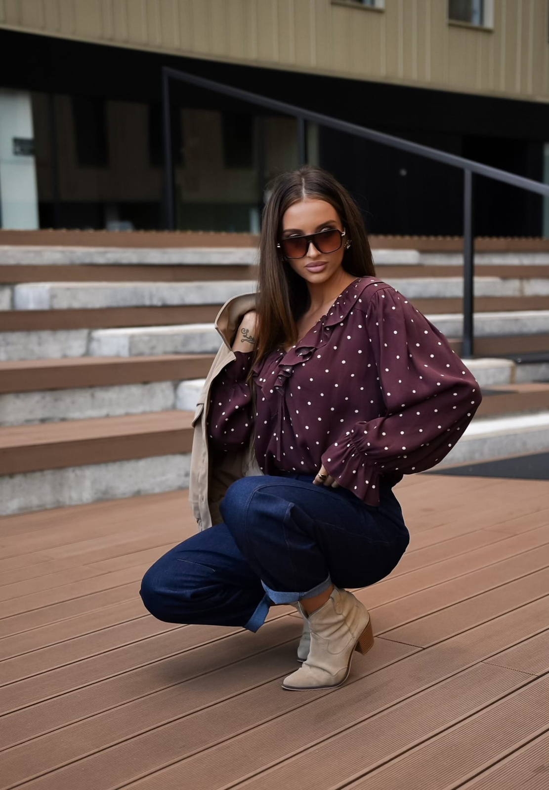 Bluzka w pięknym kolorze i ozdobna falbanka przy dekoldzie. .. Bluzka idealnie skomponuje się z czarna spodnica MILENA , a także z dżinsami.