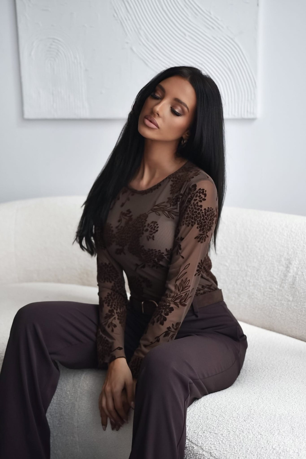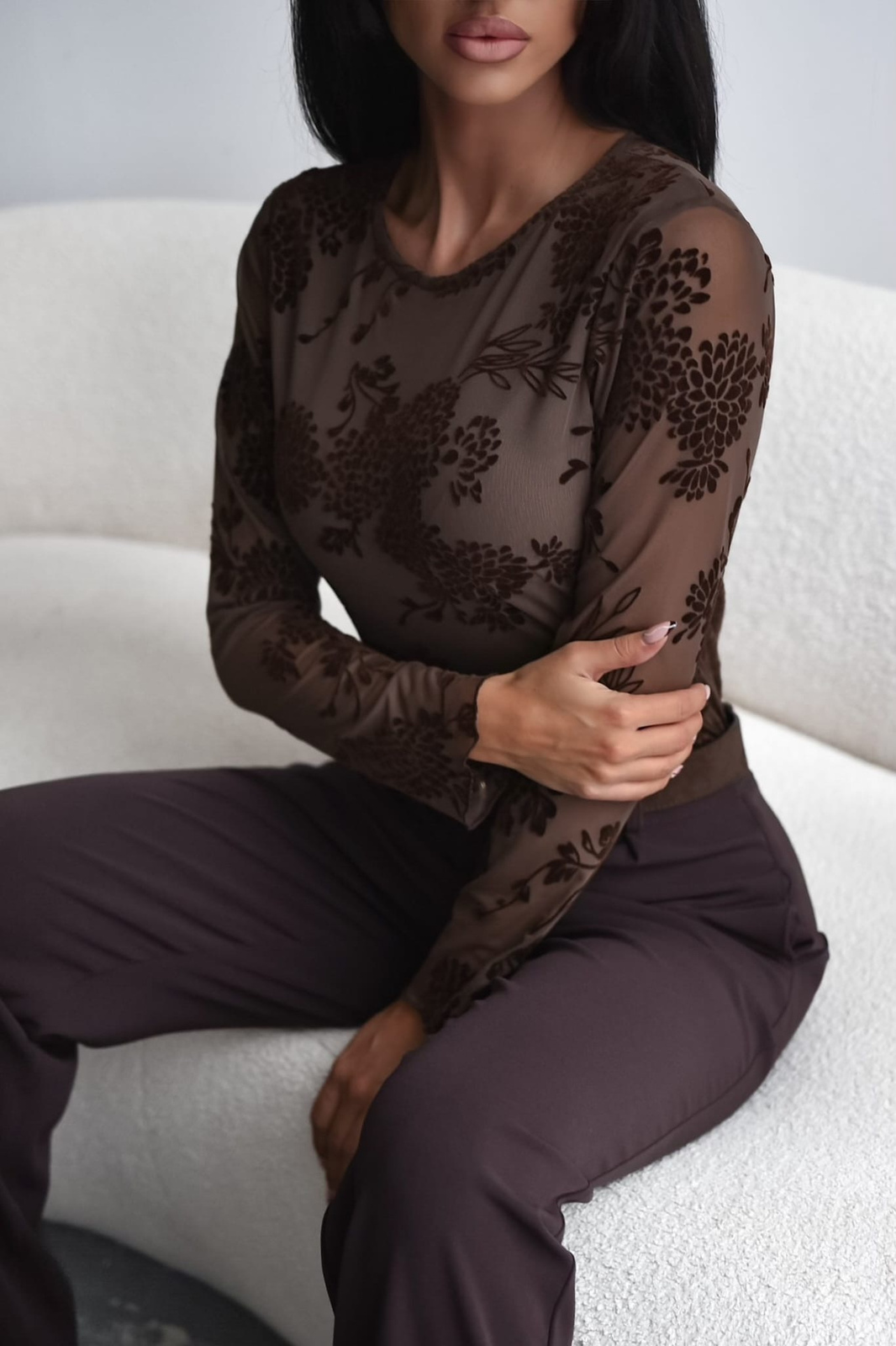 Brazowa dopasowana bluzka damska z siatki AMALFI