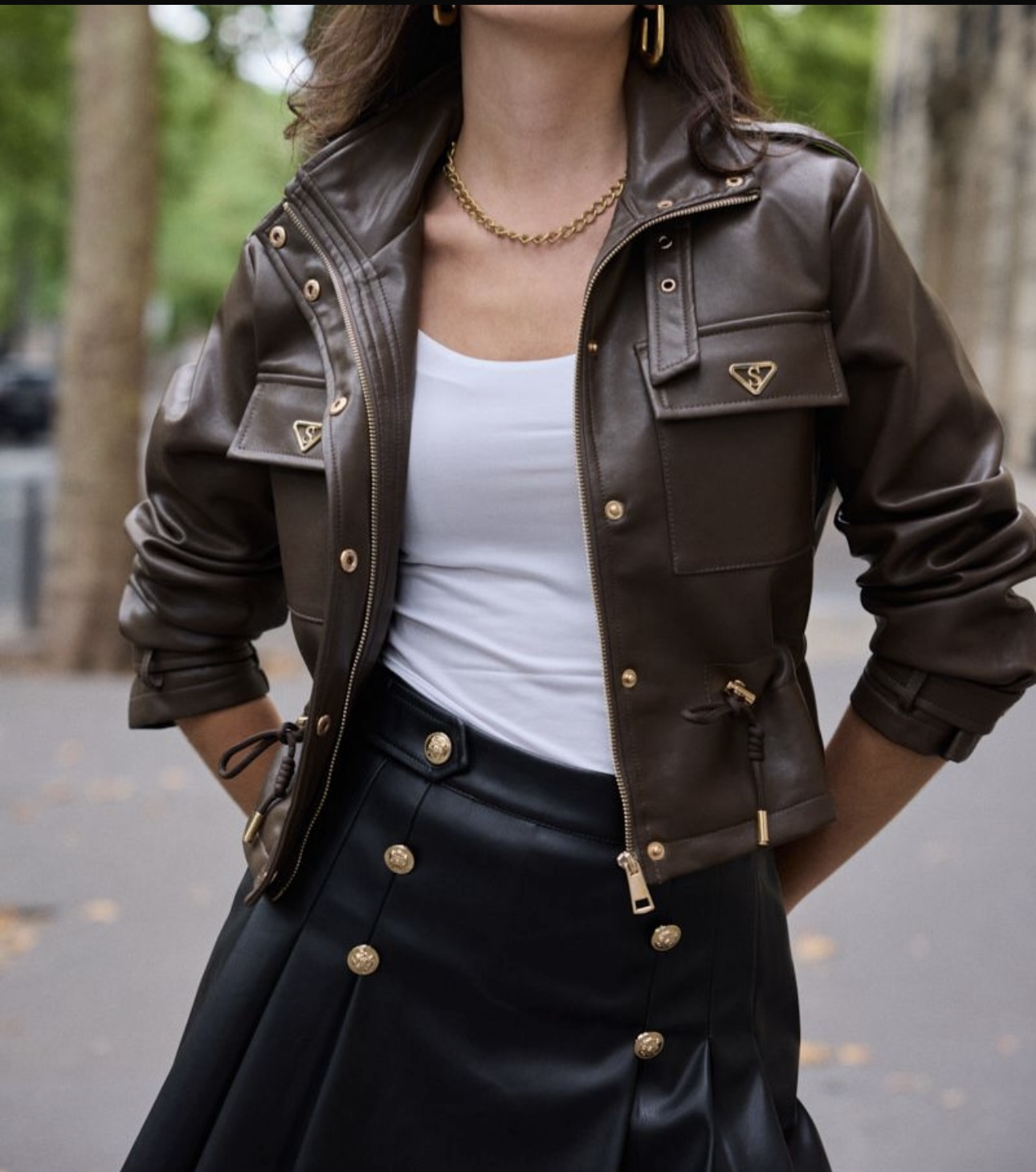 Kurtka z eko skory łączy sportowy styl z elegancja. Idealnie sprawdzi sie w stylizacji zarówno ze spodniami jak i z sukienkami stanowiąc uniwersalny i wygodny element garderoby.