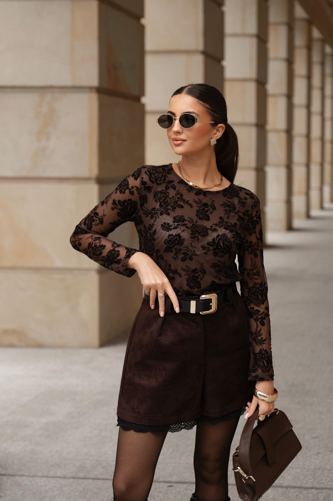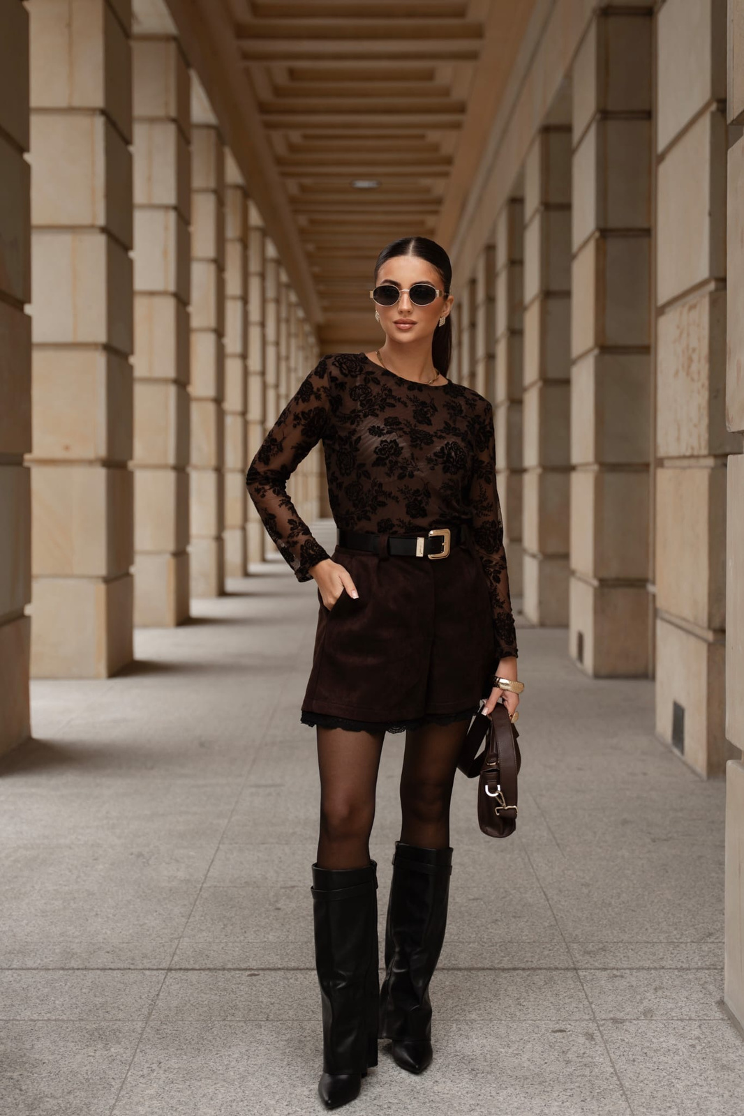 Brązowe zamszowe spodenki damskie z ozdobna koronka PAULA