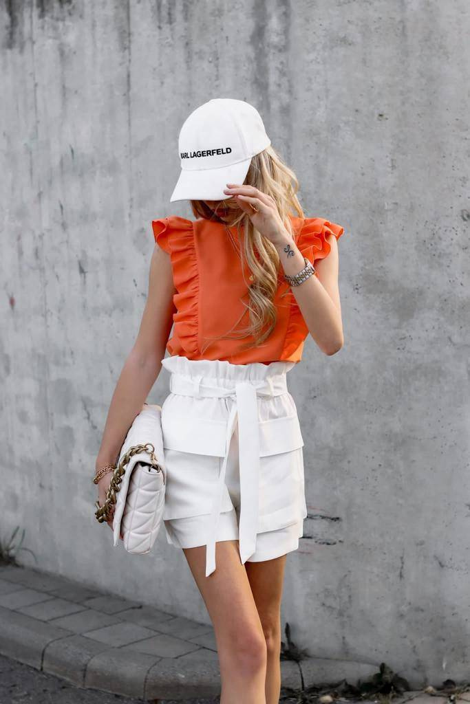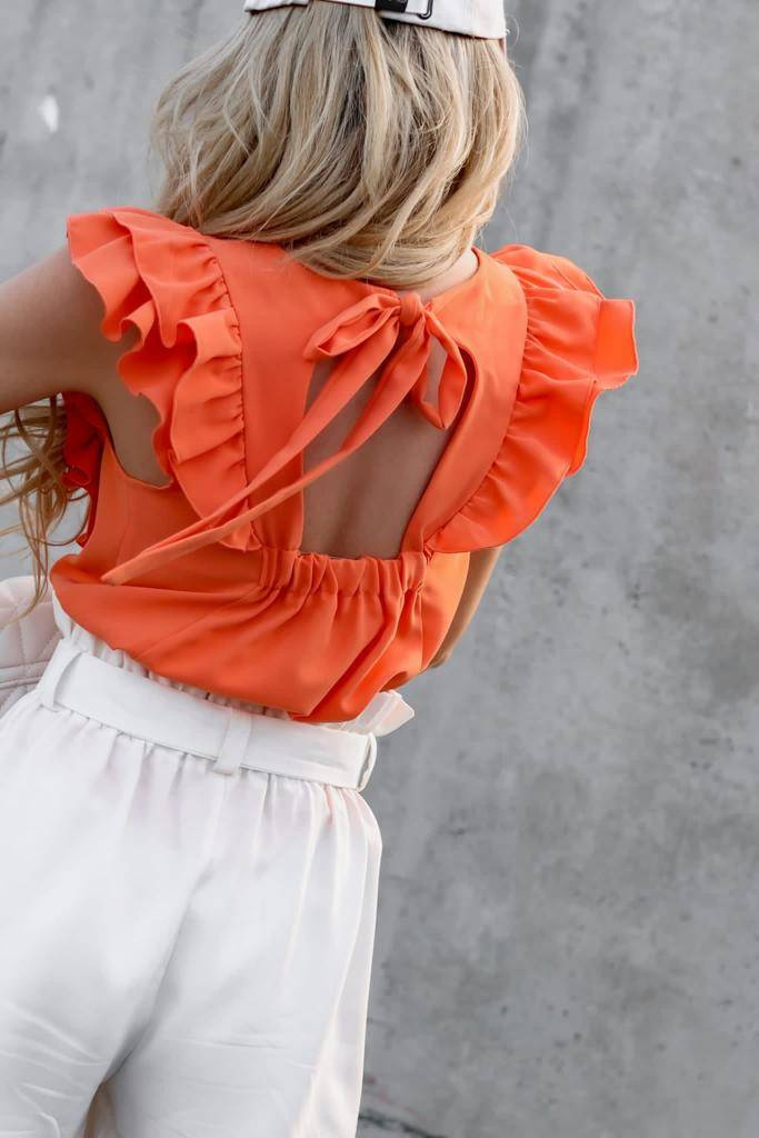 Pomarańczowa bluzka damska z falbaną i wiązaniem na plecach DONNA