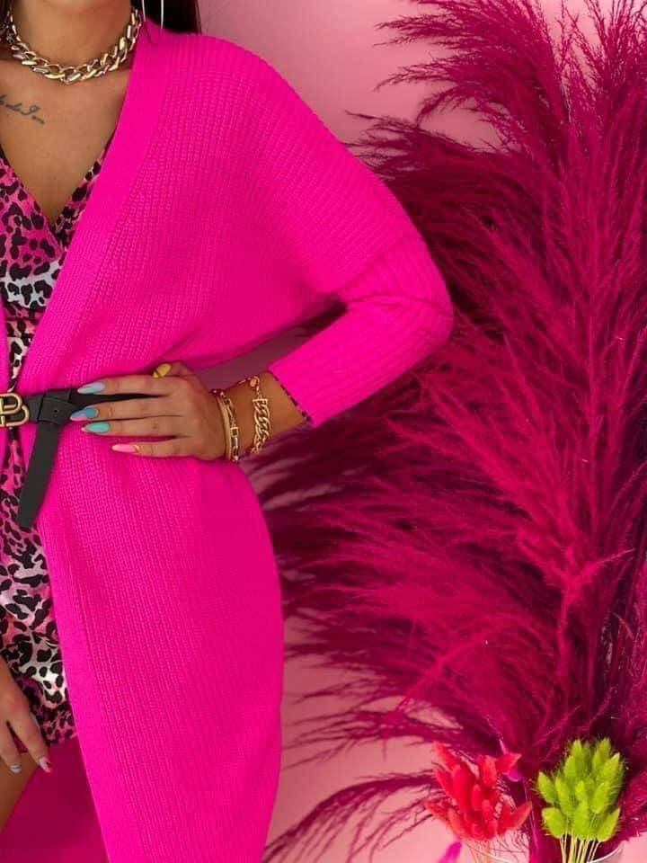 Przepiękny, różowy sweter damski- z powodzeniem może zastępować kurtkę. Sweter pasuje do wielu stylizacji- jest przyjemny w dotyku.
