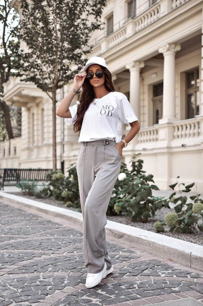 Piękne szare szerokie spodnie z prostą nogawką, to świetna propozycja na jesień. Spodnie maja wyższy stan co pięknie modeluje sylwetkę. Cudownie wyglądają z białą bluzką z krótkim rękawem, a także w zestawieniu z szara bluzką CAROLINE.